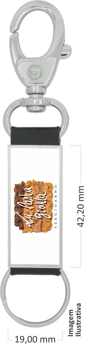 Chaveiro em couro sintético com tubo metálico 42x19mm com personalização e finalização em resina epóxi.